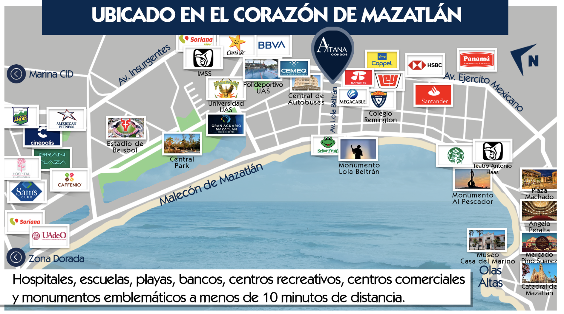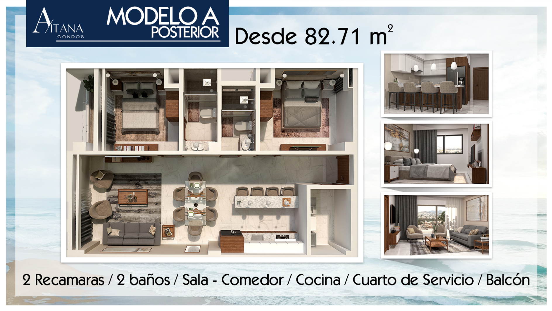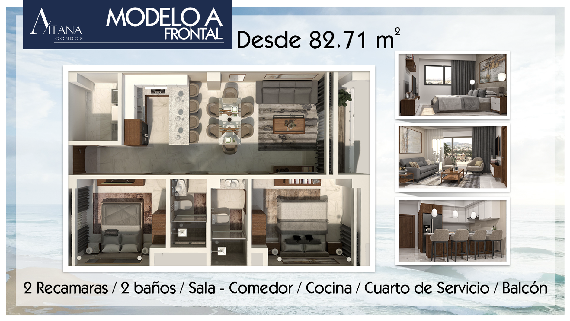 AITANA CONDOS, son departamentos en PREVENTA, ubicados a 3 metros del malecón de Mazatlán. Se entregan en Noviembre del 2026. Son de 2 recámaras, 2 baños completos, sala comedor, cocina integral, área de lavado. Tenemos departamentos de 2 recámaras, por lo mismo, son diferentes precios, van desde $ 3'268,208 de 84.9 m2, en adelante