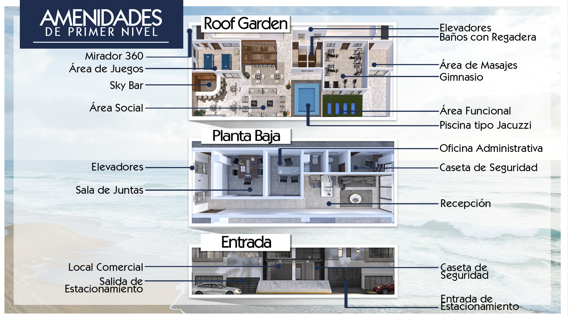 El edificio contará con 2 elevadores, escaleras, alberca, jacuzzi, gimnasio, área de asadores, sky bar tendrá acceso controlado, y podrás monitorear tus rentas desde tu casas, lo que le da certidumbre a tu inversión.