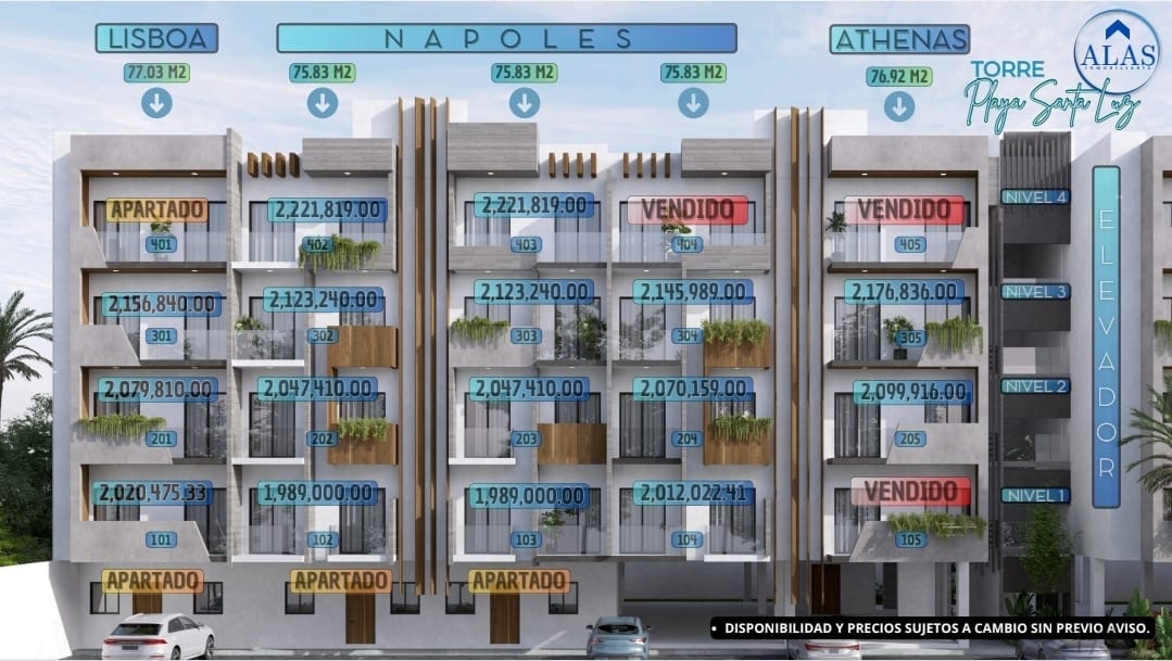 Departamentos "PLAYA RESIDENCIAL" se entregan aproximadamente en febrero del 2026. Entre sus características y amenidades, son departamentos con acceso controlado, en cada torre hay alberca y elevador. Los precios están sujetos a cambios sin previo aviso, y se refieren a departamentos sin equipamiento ni muebles. El constructor le ofrece al cliente diferentes paquetes de equipamiento y muebles a elegir, con su respectivo costo. Está ubicado a 7 minutos de Valentino´s y las playas.