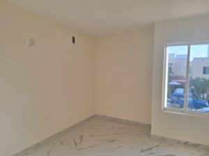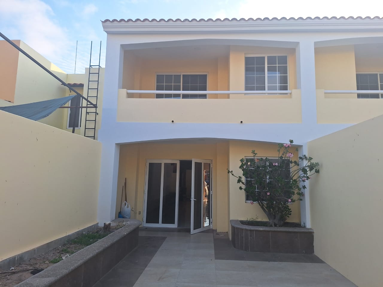 La casa tiene esta distribución: En planta baja, cochera descubierta para 2 autos, sala comedor, cocina integral, 1 recámara, 1 baño completo, cuarto de lavado y amplio patio. En planta alta, hay una sala de Tv, 2 recámaras y un baño completo.